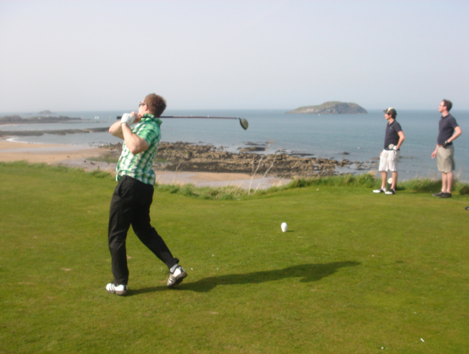 The idea was to make the trip to Scotland and play a Ryder Cup style tournament of New Zealand v England.  We made the trip up there and ensured we kept things pretty well behaved the night before the first round in order to make our golf something less than terrible.  Upon arriving at the course the next morning, there was no sign of our English opposition.  We waited a while and finally a car load of them turned up, but they were in a hell of a state.  One of them vomitted out of the door in the carpark and the others looked like they weren't far behind.  So we left them there.  We went and played golf.  They didn't.
