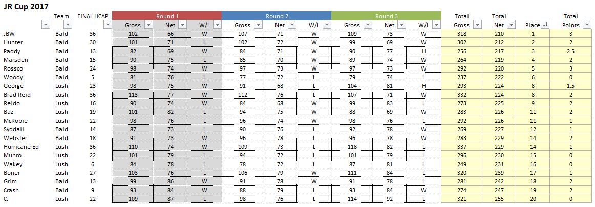 Some say the worst tag-line ever, but that didn't stop the baldies absolutely dealing to their more folically endowed competition.  Three baldies went undefeated through the competition (JWB, Patty & Rosco) whereas the lagging lushers had three who failed to score a solitary point (Wakey, Munro & CJ).  A winning margin like that may never be repeated and rest assured the baldies let the opposition know it.